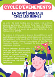 Ce cycle de 4 évènements se propose de sensibiliser le grand public à la question de la santé mentale des jeunes, en informant, déstigmatisant, en la situant dans le réseau de déterminants familiaux, scolaires, sociaux, économiques, en identifiant des ressources locales, en favorisant la prévention et une mobilisation citoyenne.